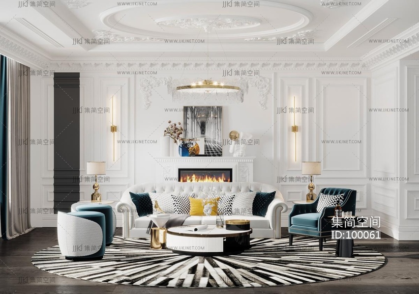 中古风客厅,美式客厅,圆形茶几,装饰画,移动电视,3d模型下载