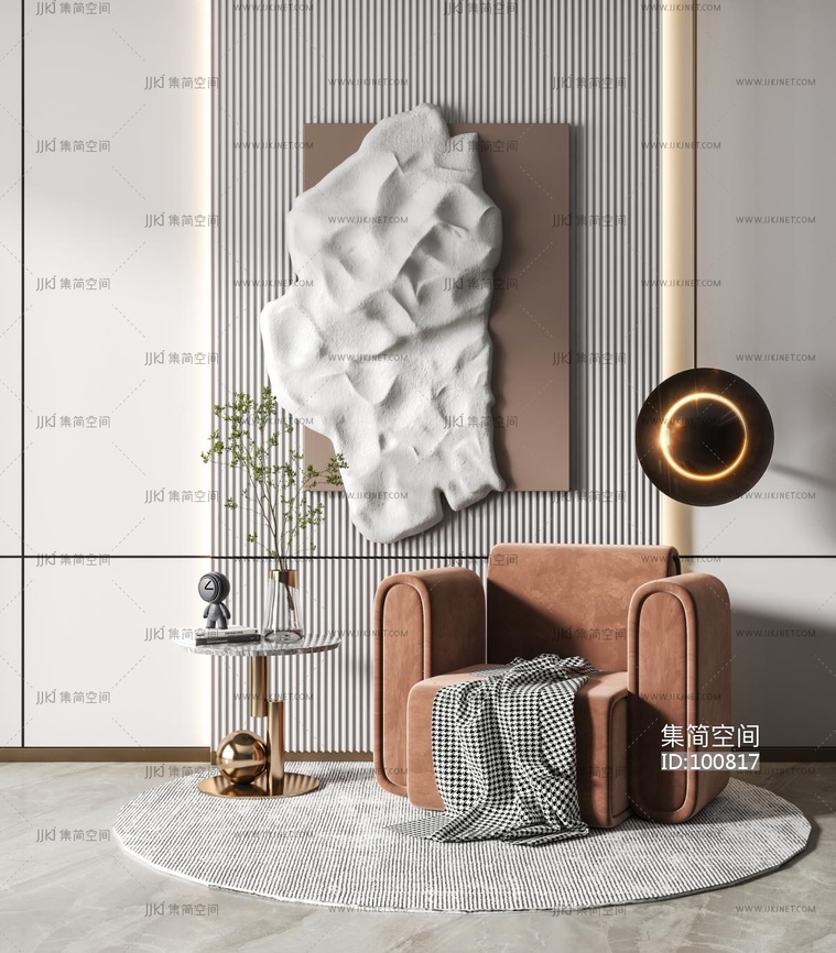 36现代绒布单椅,沙发椅,圆几,角几,边几,花瓶,挂画,装饰画,立体画,地毯,吊灯 3d模型下载 [模型ID:100817]