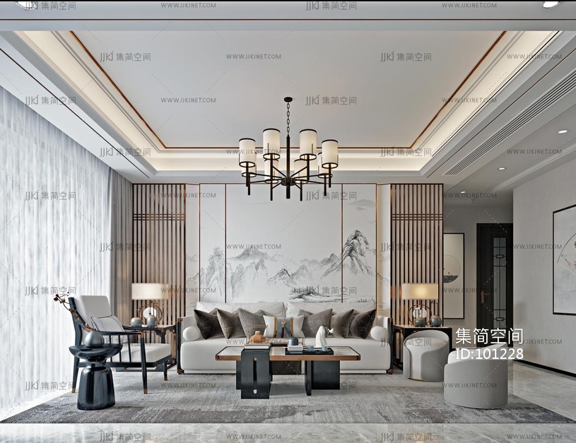 中古风客厅 沙发茶几组合 背景墙3d模型下载