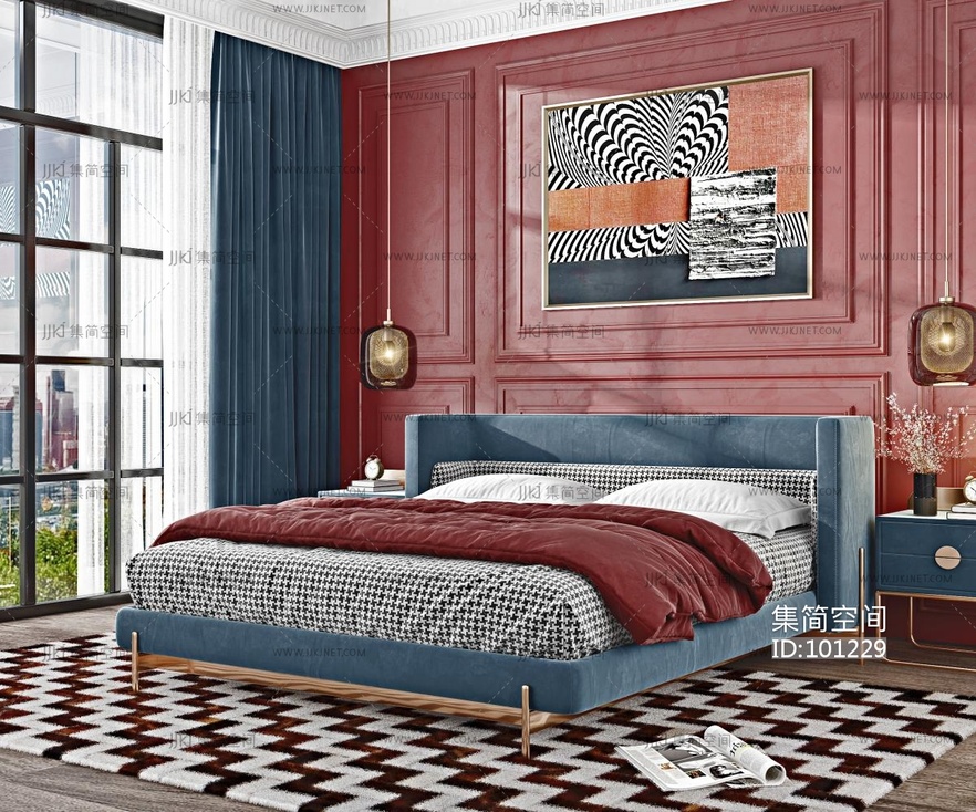 美式卧室绒布双人床 3d模型下载 [模型ID:101229]