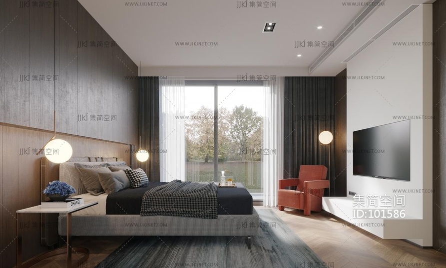卧室,轻奢,暗黑风,现代轻奢卧室双人床,懒人沙发法式卧室3d模型下载