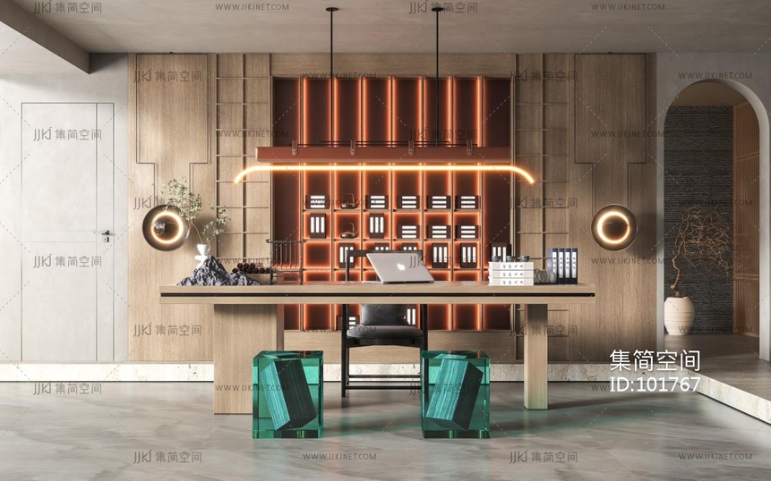 现代书房 书桌椅 壁柜 挂画 吊灯 书 盆栽 摆件3d模型下载