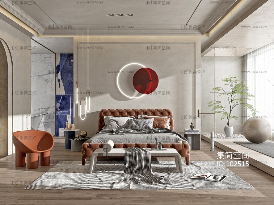 卧室,轻奢,暗黑风,现代轻奢卧室双人床,懒人沙发法式卧室3d模型下载