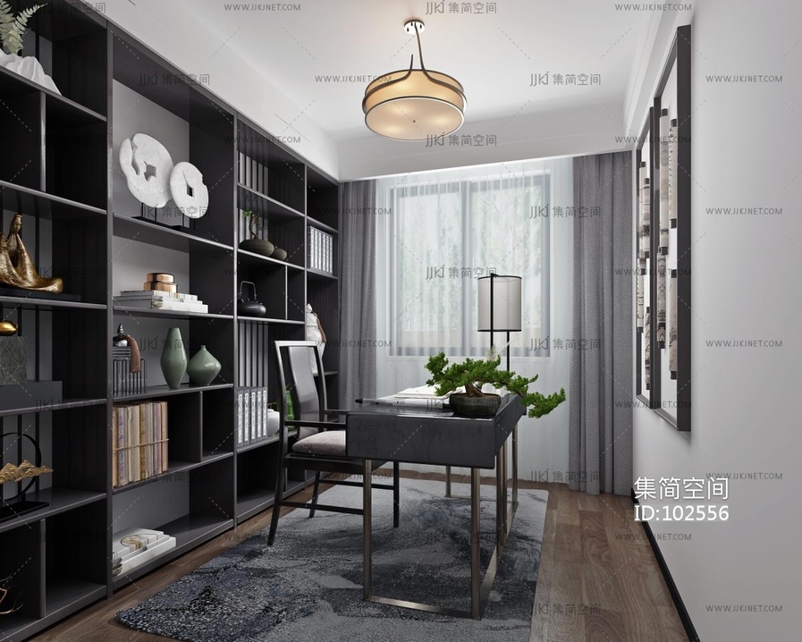 现代书房 书桌椅 壁柜 挂画 吊灯 书 盆栽 摆件3d模型下载