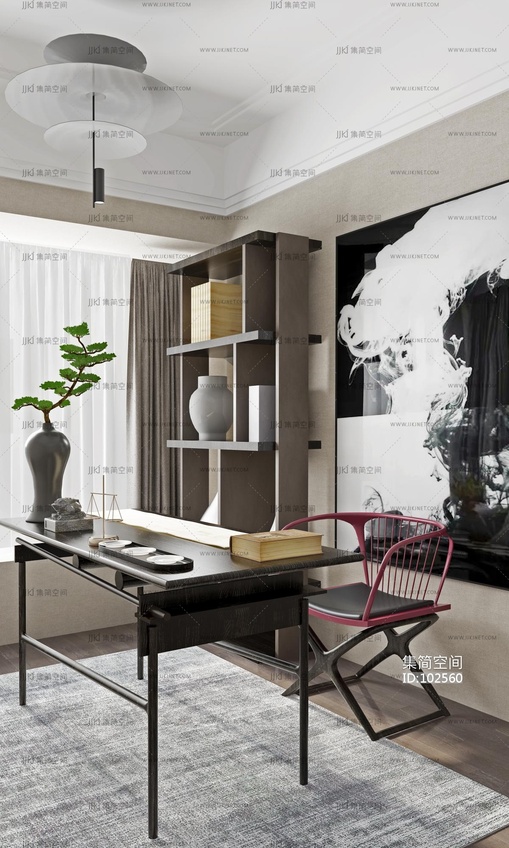 现代书房 书桌椅 壁柜 挂画 吊灯 书 盆栽 摆件3d模型下载