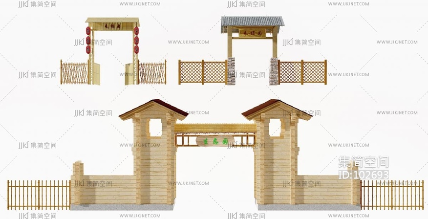 新中式山庄度假村大门,门头,门楼栅栏围墙 3d模型下载 [模型ID:102693]
