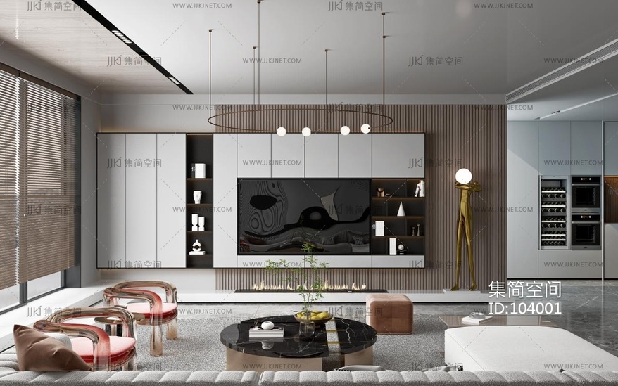 中古风客厅,美式客厅,圆形茶几,装饰画,移动电视,3d模型下载