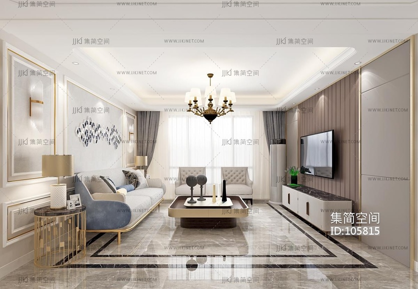 中古风客厅,美式客厅,圆形茶几,装饰画,移动电视,3d模型下载