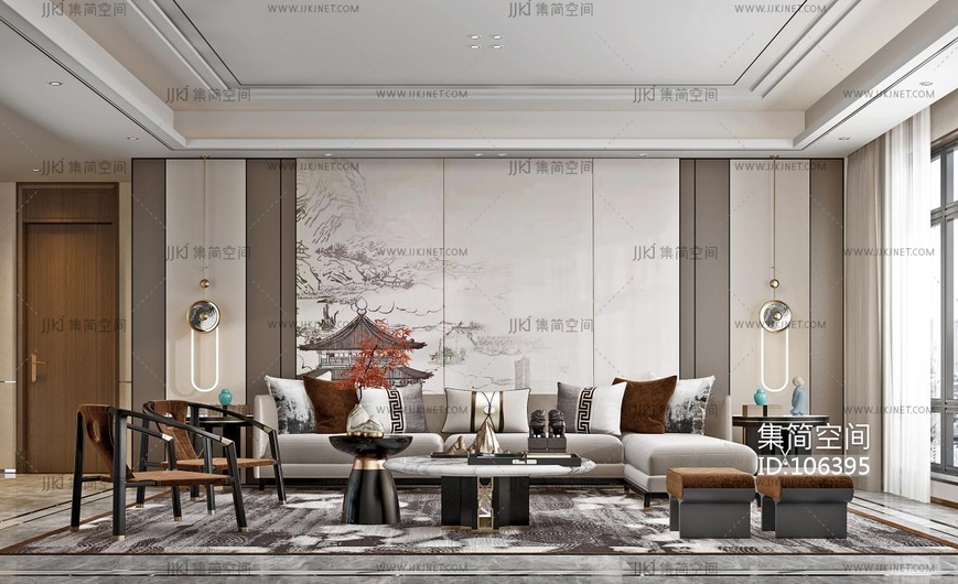 中古风客厅 沙发茶几组合 背景墙3d模型下载