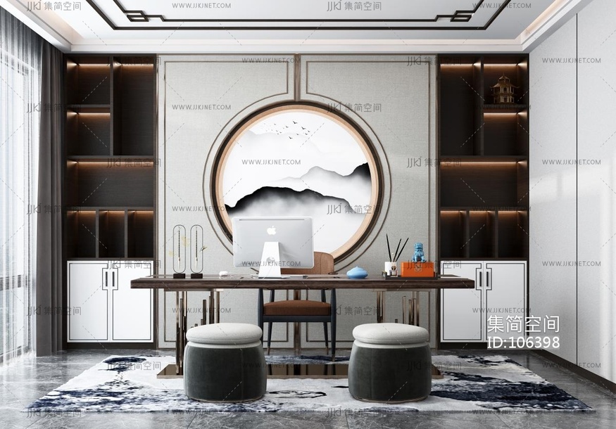 现代书房 书桌椅 壁柜 挂画 吊灯 书 盆栽 摆件3d模型下载