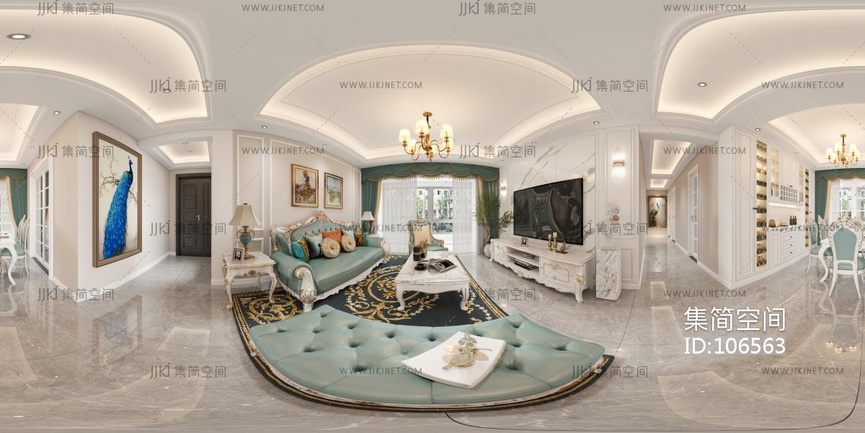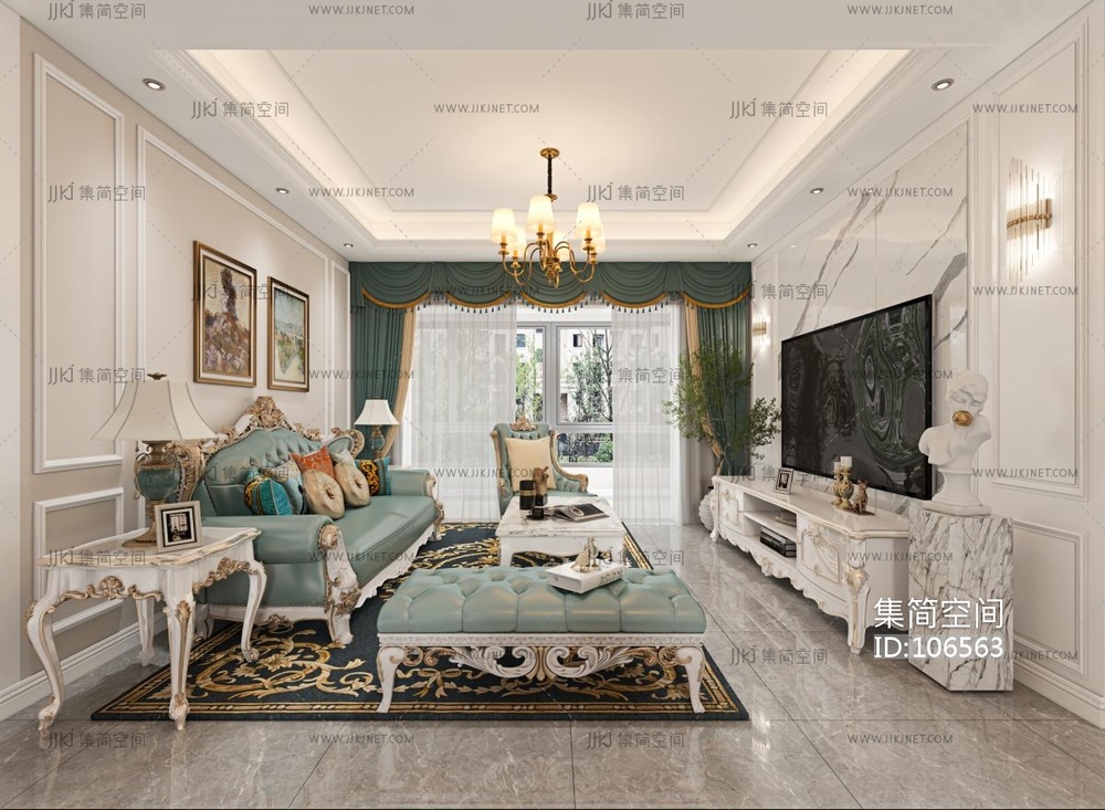 02简欧法式 客厅,沙发座椅茶几组合,电视柜,边柜,吊灯 3d模型下载 [模型ID:106563]