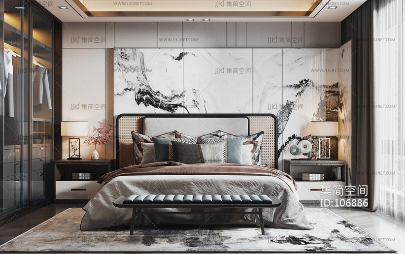 卧室,轻奢,暗黑风,现代轻奢卧室双人床,懒人沙发法式卧室3d模型下载