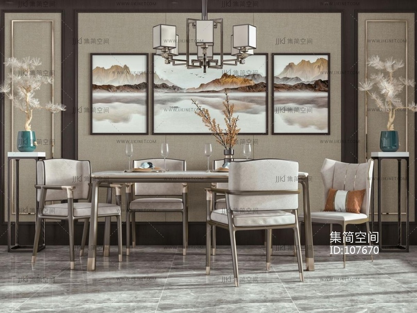 01新中式餐厅餐桌椅,摆台挂画 3d模型下载 [模型ID:107670]