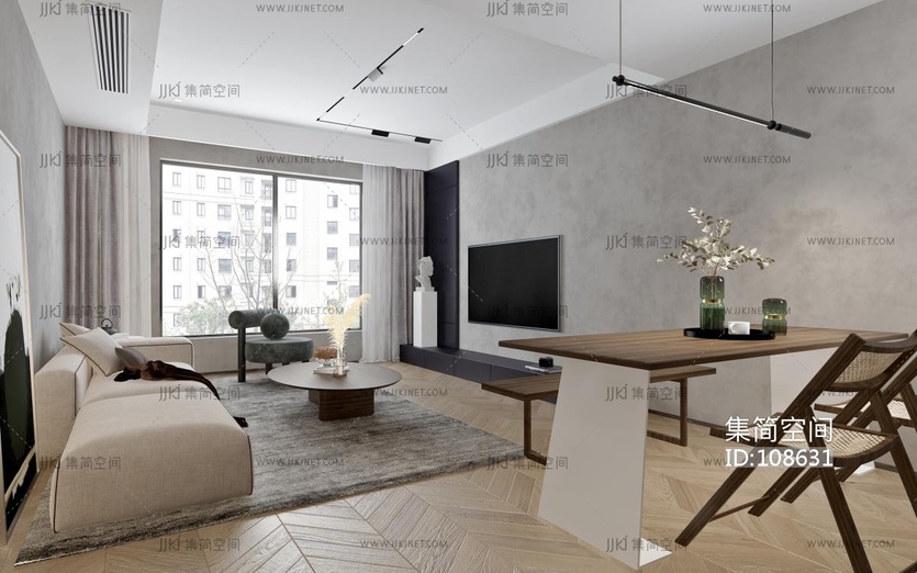 中古风客厅,美式客厅,圆形茶几,装饰画,移动电视,3d模型下载