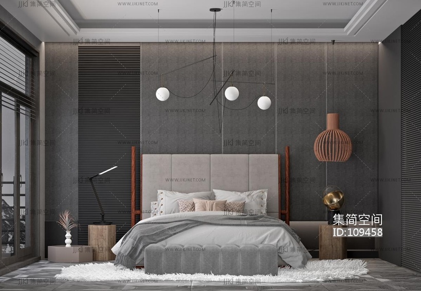 现代卧室,双人床,球形吊灯,边几,台灯 3d模型下载 [模型ID:109458]