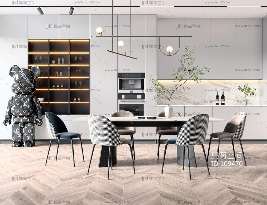 现代轻奢餐厅,餐桌餐椅,暴力熊雕塑,吊灯,酒柜 (1) 3d模型下载 [模型ID:109470]