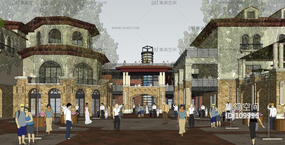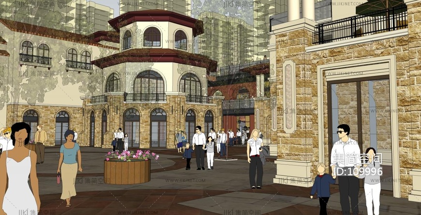 西班牙风格商业街建筑设计方案su模型 su草图模型下载 [模型ID:109996]