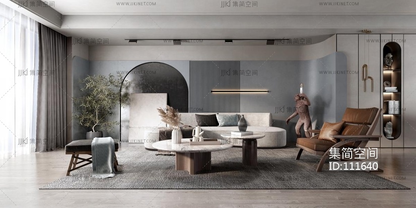 中古风客厅,美式客厅,圆形茶几,装饰画,移动电视,3d模型下载