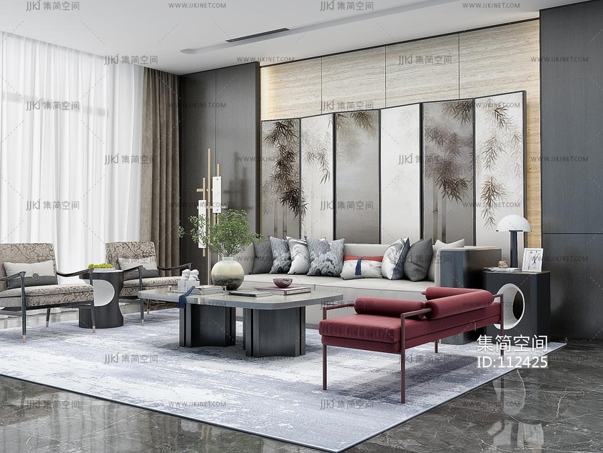 中古风客厅 沙发茶几组合 背景墙3d模型下载