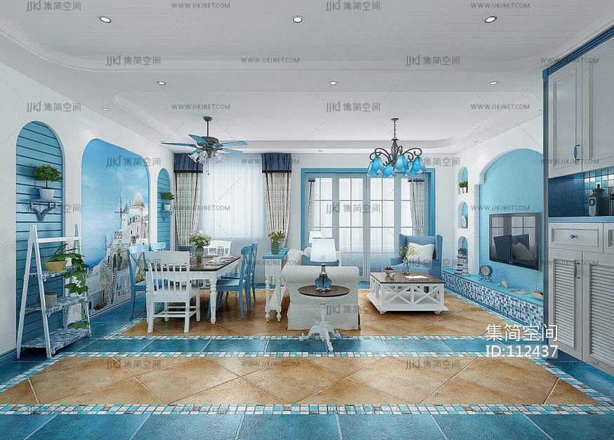地中海风格客餐厅沙发餐桌椅, 3d模型下载 [模型ID:112437]