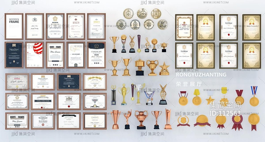 现代奖状,奖牌,奖杯荣誉证书,荣誉墙3d模型下载