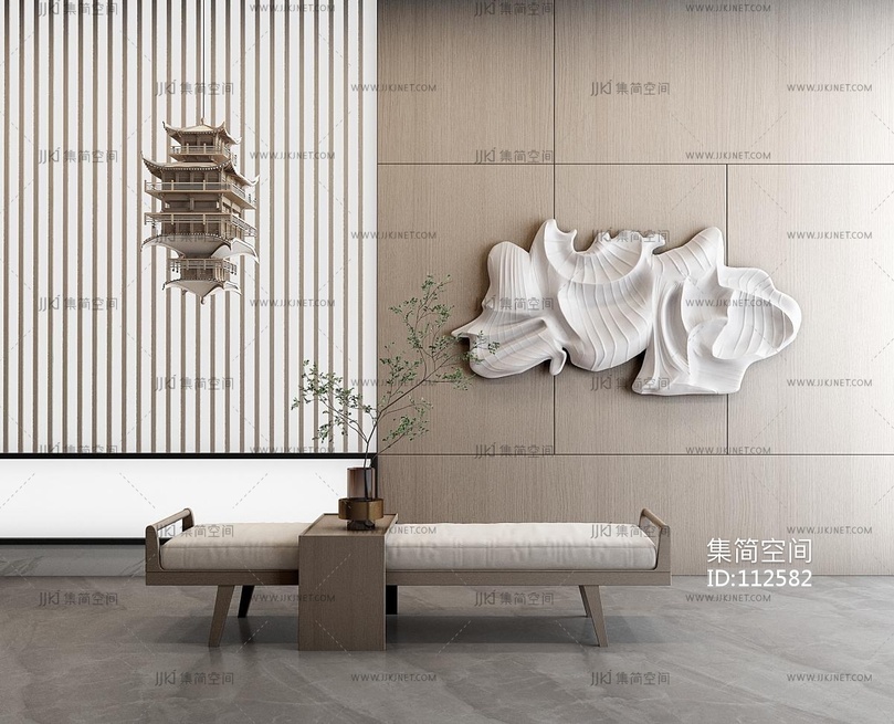 新中式墙面装置艺术品沙发凳,脚凳,床尾踏凳 3d模型下载 [模型ID:112582]