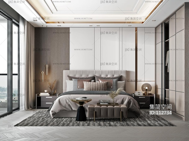 卧室,轻奢,暗黑风,现代轻奢卧室双人床,懒人沙发法式卧室3d模型下载