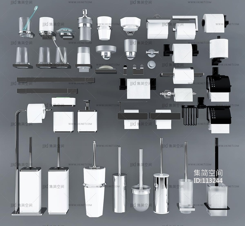 现代纸巾盒,马桶刷,五金件组合卫浴用品 3d模型下载 [模型ID:113244]
