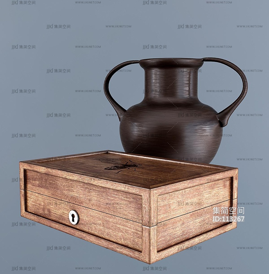 现代实木储物箱,陶瓷罐组合 3d模型下载 [模型ID:113267]