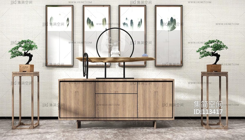中式实木边柜盆栽装饰画,挂画摆件组合 3d模型下载 [模型ID:113417]