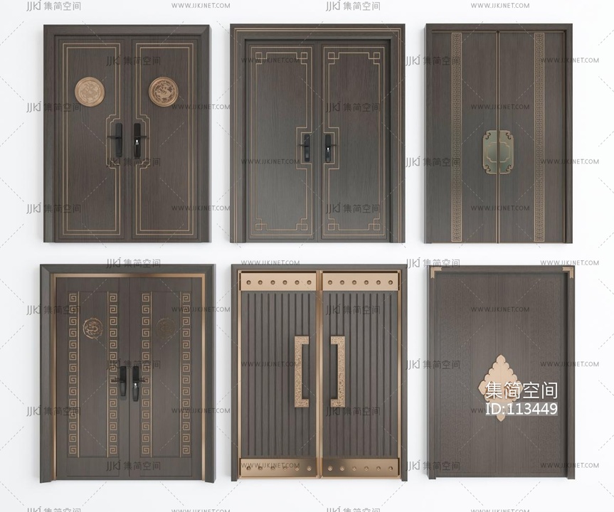06新中式双开门 入户门,门把手拉手 3d模型下载 [模型ID:113449]