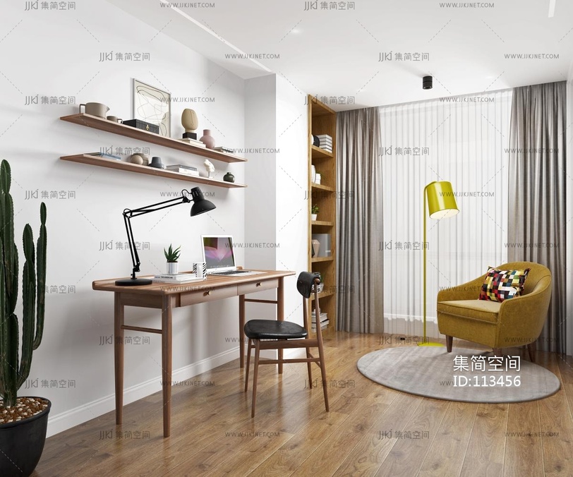 现代书房 书桌椅 壁柜 挂画 吊灯 书 盆栽 摆件3d模型下载
