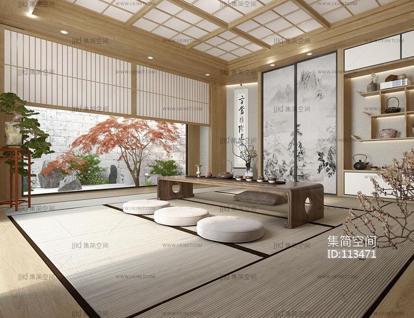 新中式茶室 茶桌 ,藤编编织吊灯,竹竿3d模型下载