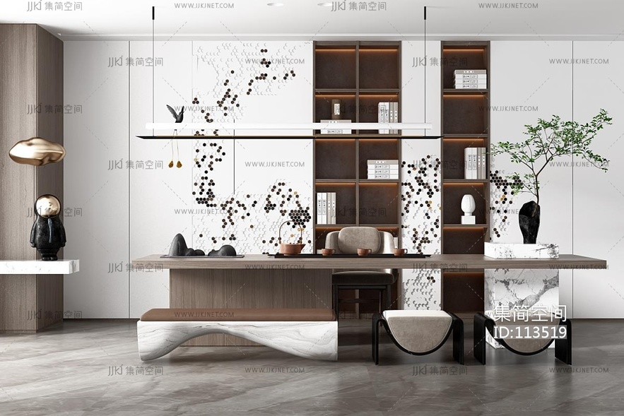 现代书房 书桌椅 壁柜 挂画 吊灯 书 盆栽 摆件3d模型下载