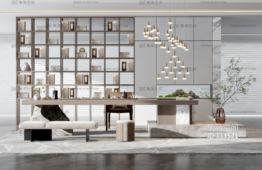 现代书房 书桌椅 壁柜 挂画 吊灯 书 盆栽 摆件3d模型下载