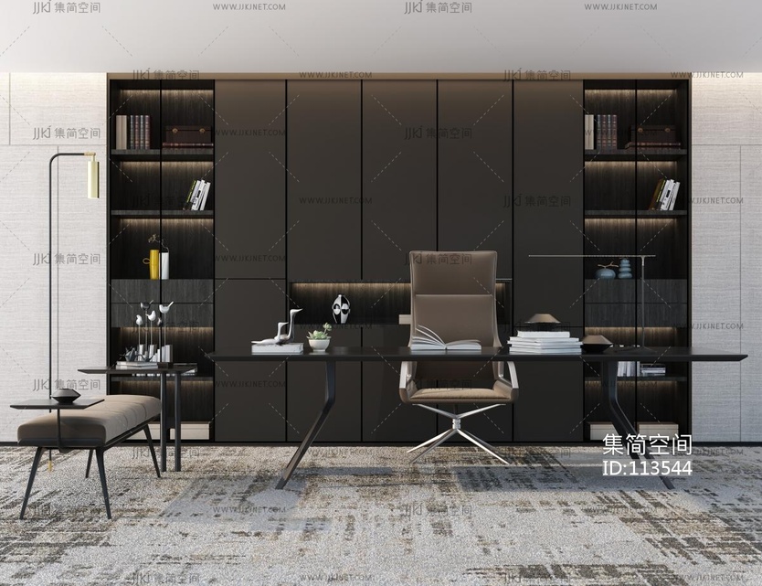 现代书房 书桌椅 壁柜 挂画 吊灯 书 盆栽 摆件3d模型下载