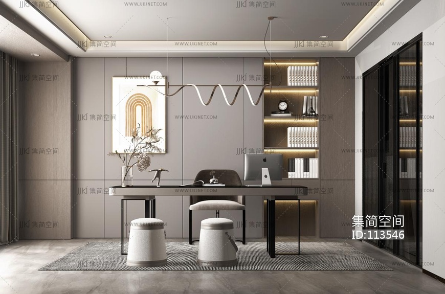 现代书房 书桌椅 壁柜 挂画 吊灯 书 盆栽 摆件3d模型下载