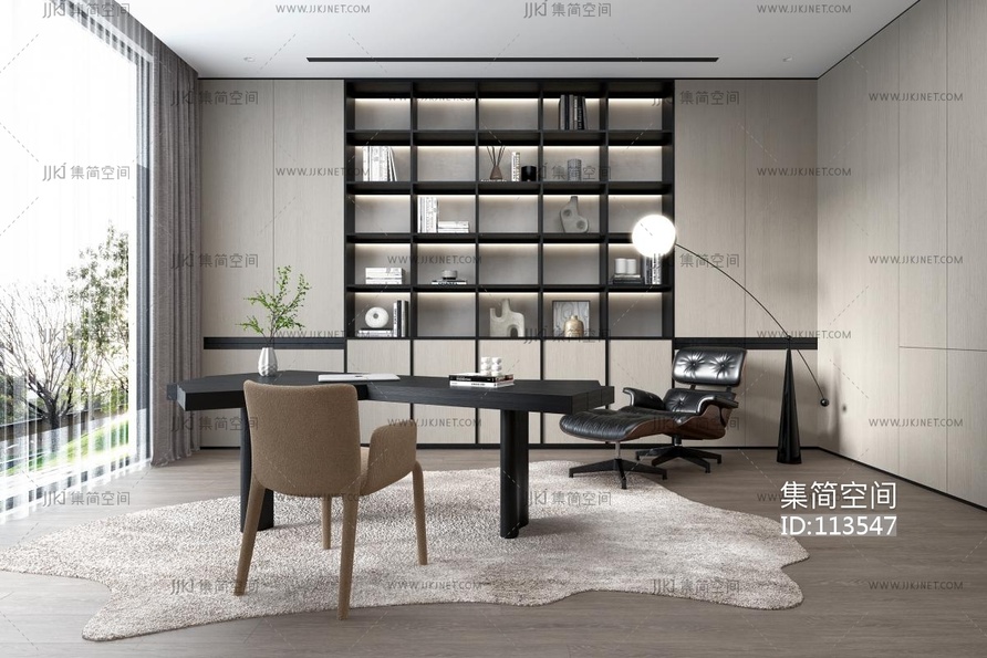 现代书房 书桌椅 壁柜 挂画 吊灯 书 盆栽 摆件3d模型下载