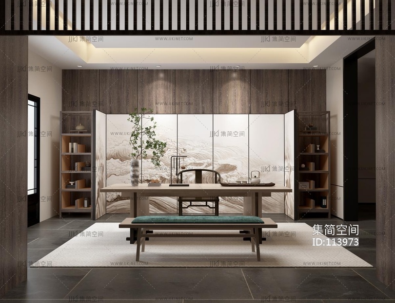 现代书房 书桌椅 壁柜 挂画 吊灯 书 盆栽 摆件3d模型下载