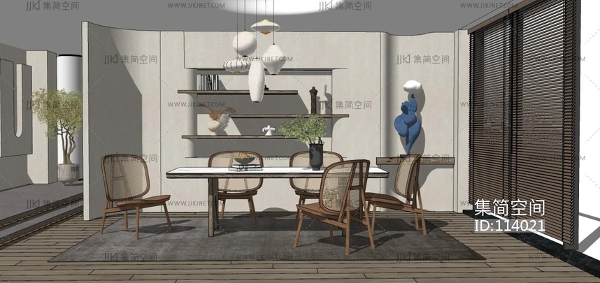 现代侘寂风餐厅,餐桌椅盆栽, su草图模型下载 [模型ID:114021]
