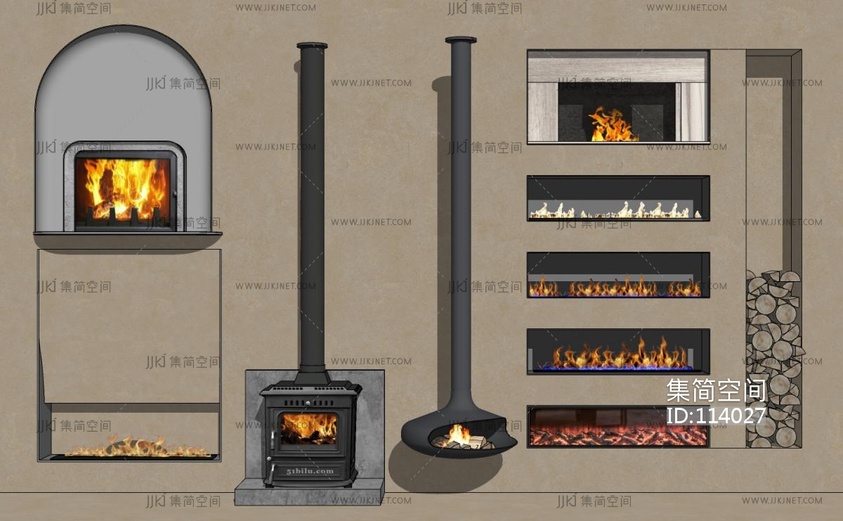 现代工业风壁炉,吊炉,劈柴柴火 su草图模型下载 [模型ID:114027]