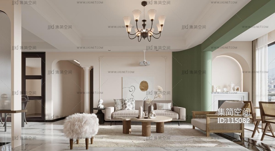 中古风客厅,美式客厅,圆形茶几,装饰画,移动电视,3d模型下载
