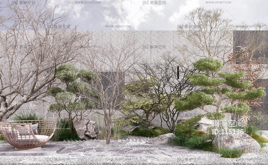 现代新中式庭院 景观植物树景观小品 3d模型下载 [模型ID:115136]