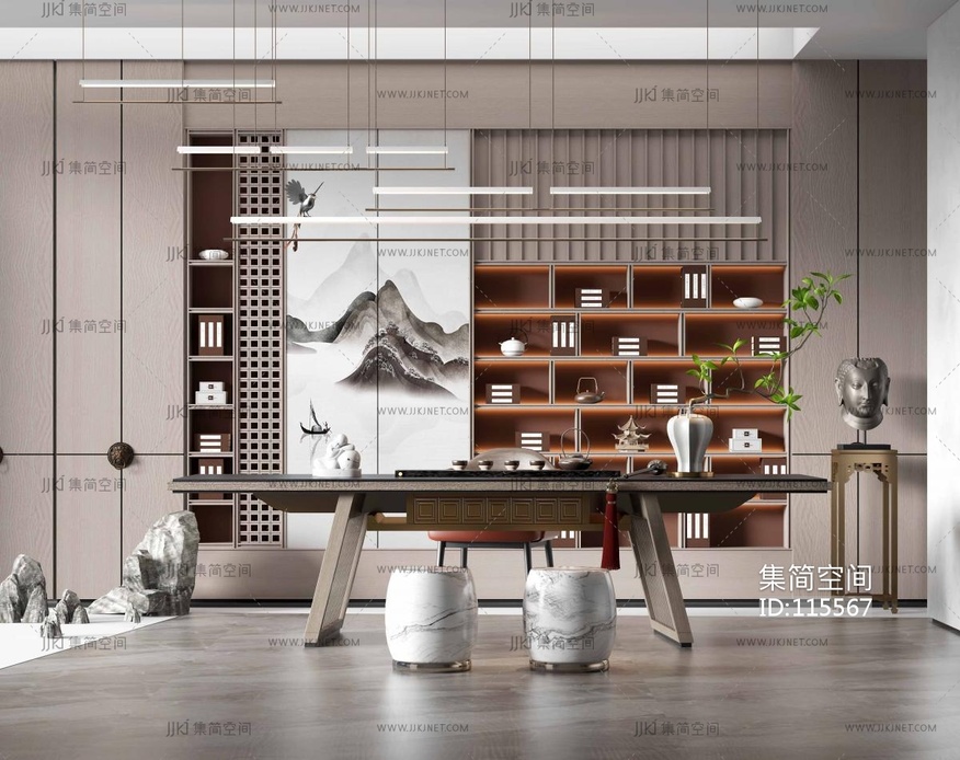 现代书房 书桌椅 壁柜 挂画 吊灯 书 盆栽 摆件3d模型下载