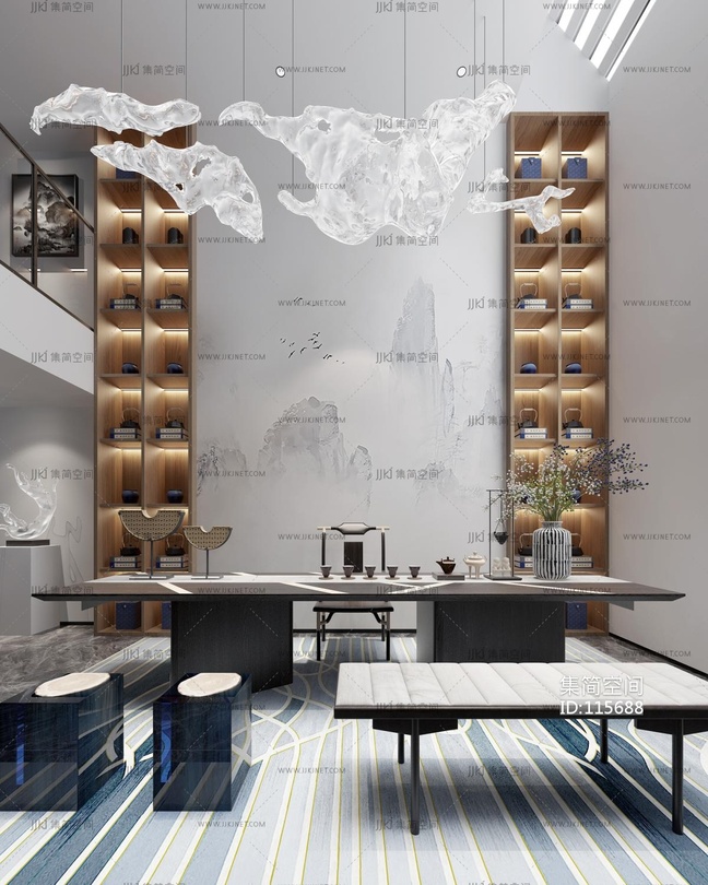 现代书房 书桌椅 壁柜 挂画 吊灯 书 盆栽 摆件3d模型下载