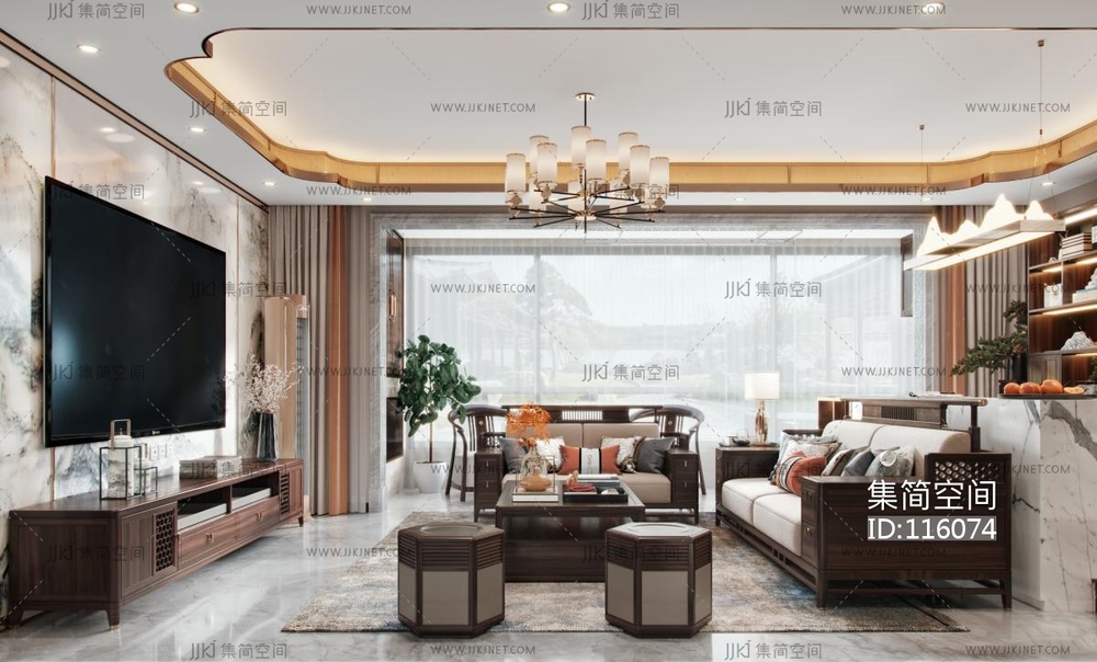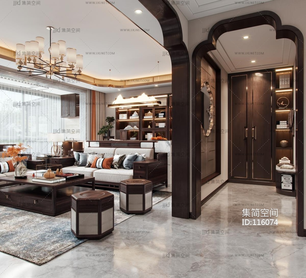 中古风客厅 沙发茶几组合 背景墙3d模型下载