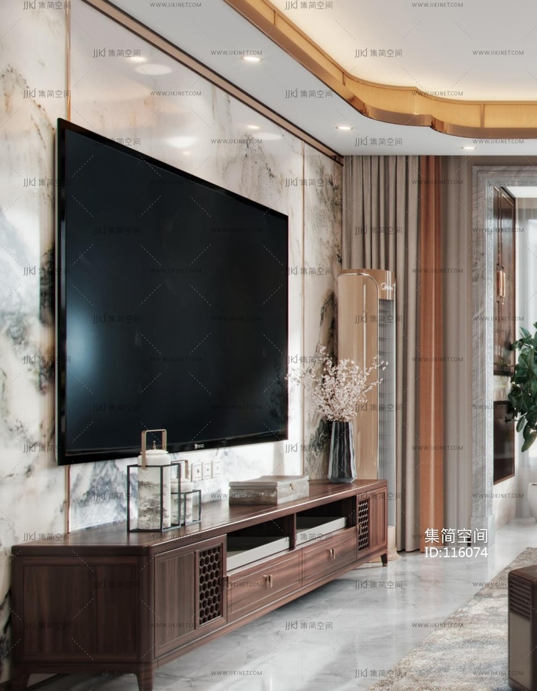 中古风客厅,美式客厅,圆形茶几,装饰画,移动电视,3d模型下载