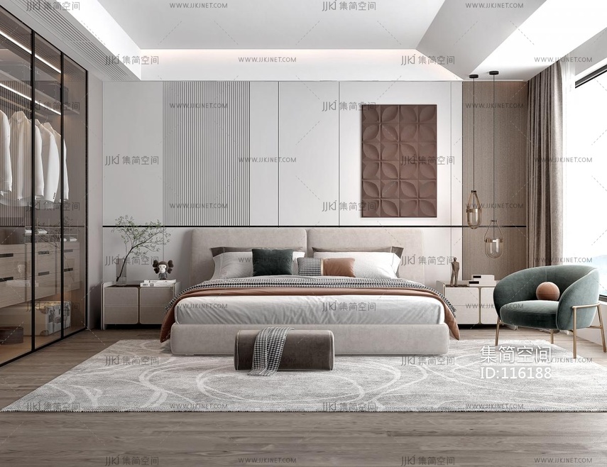 卧室,轻奢,暗黑风,现代轻奢卧室双人床,懒人沙发法式卧室3d模型下载