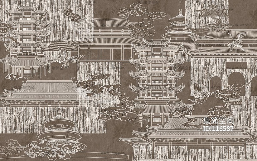 格物印画 线描阁楼 中式壁纸 中式背景装饰画 材质贴图下载