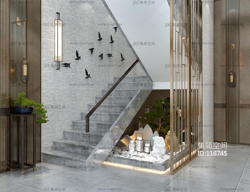 新中式楼梯间_玄关造景 3d模型下载 [模型ID:116745]